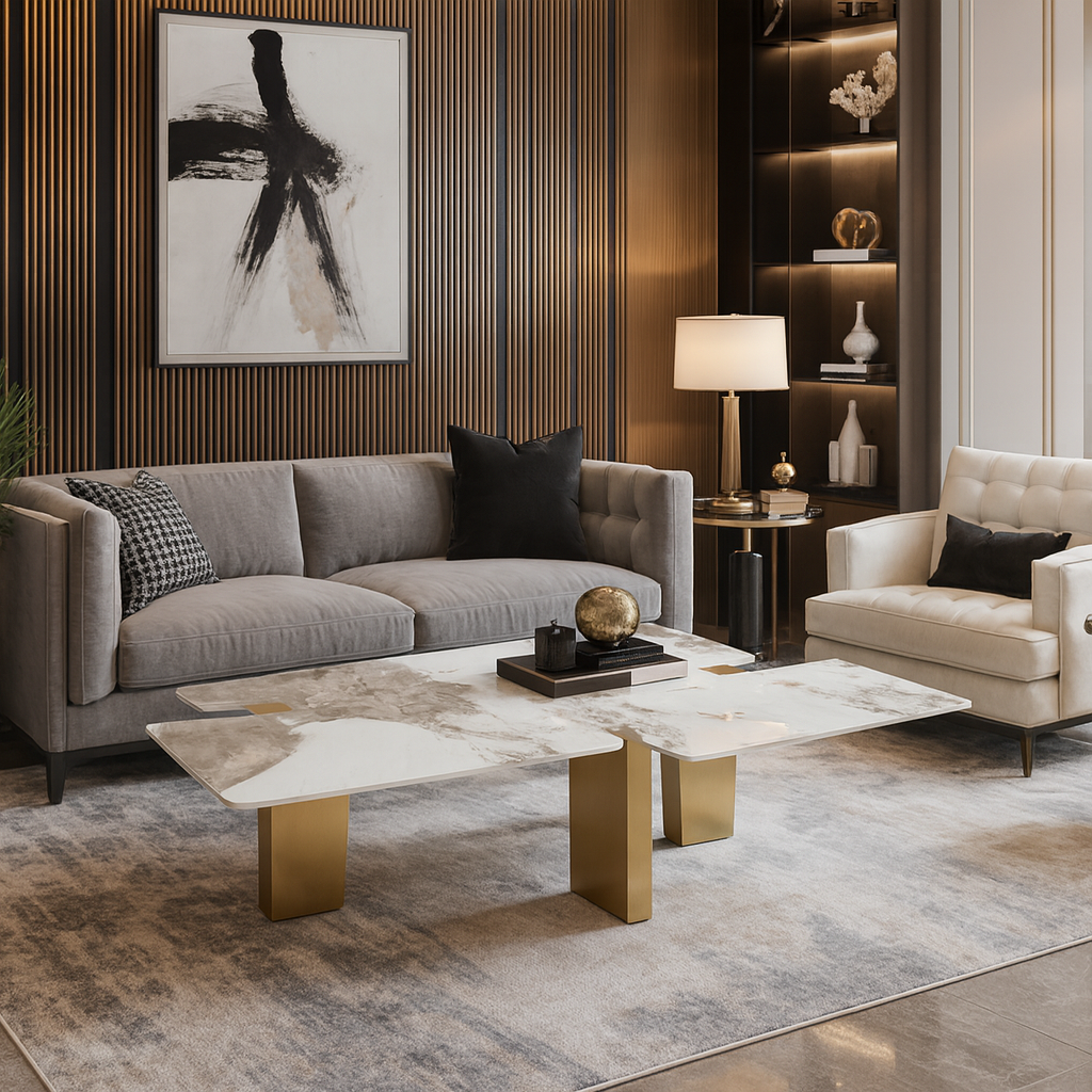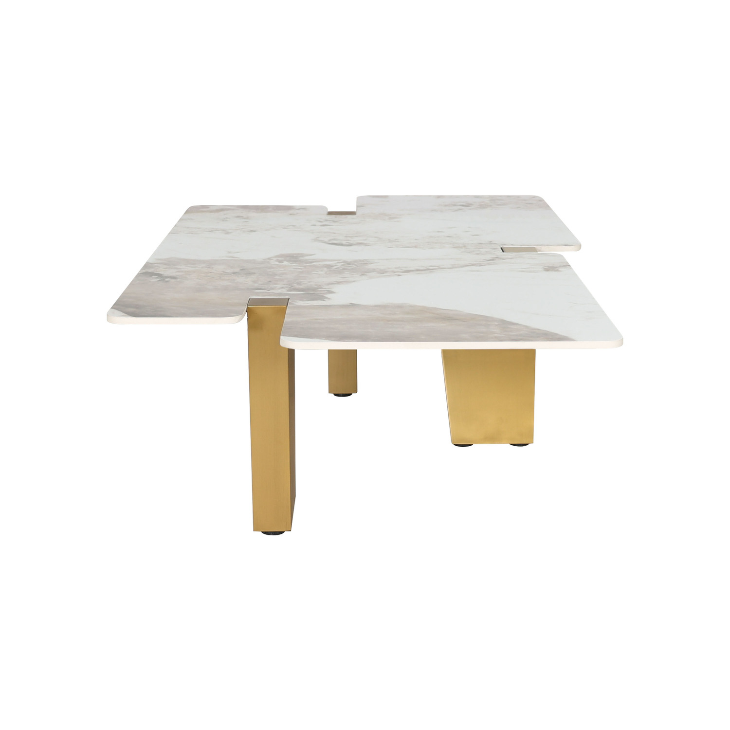 - Oryginalny stolik kawowy z podstawą w kolorze złotym, w kształcie geometrycznej bryły przestrzennej. Owalny biały blat jest imitacją marmuru. Nowoczesna forma idealnie współgra z białym marmurem i złotem.