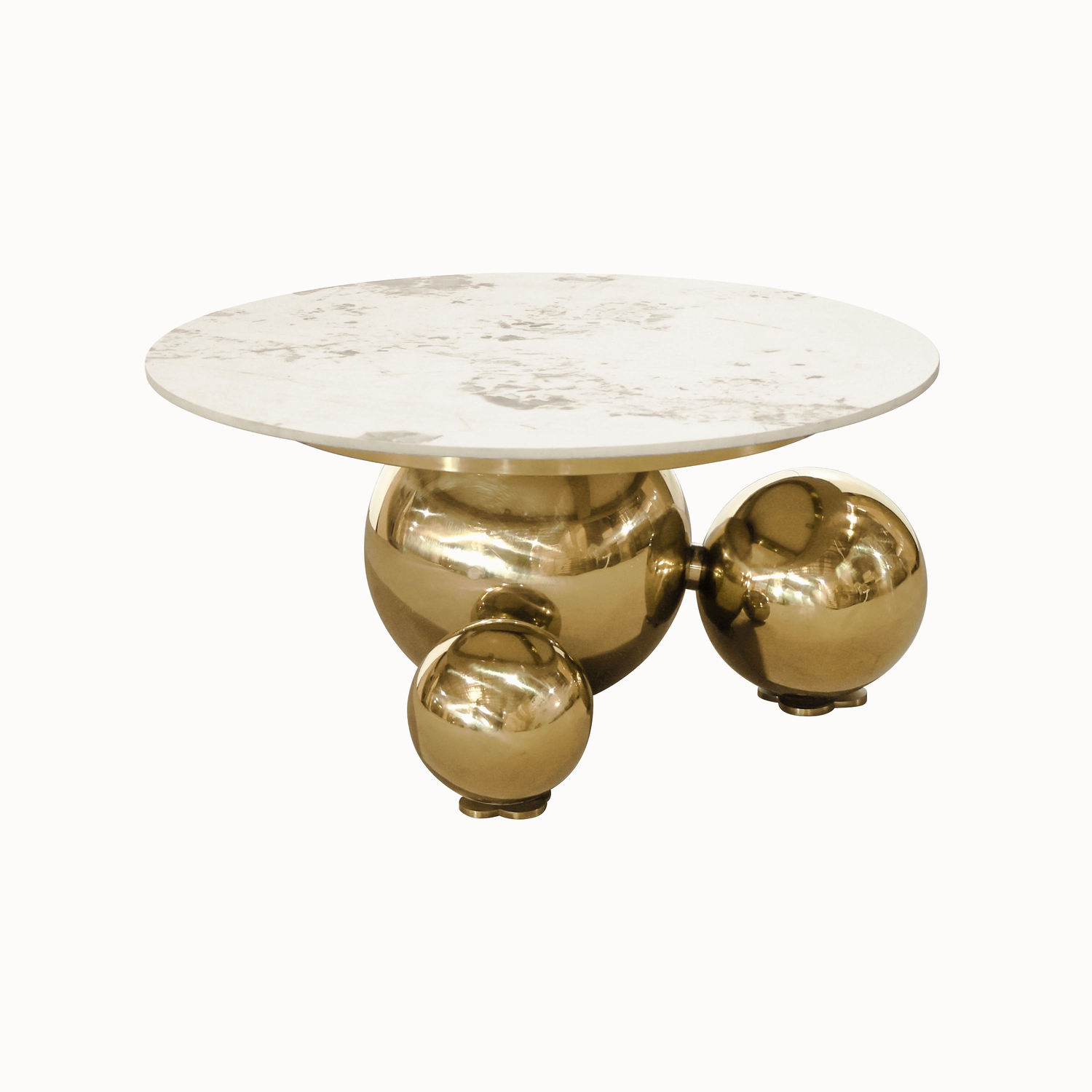 - Oryginalny stolik kawowy z podstawą w kolorze złotym. Podstawa składa się z trzech, złączonych chromowanych kul. Okrągły biały blat jest imitacją marmuru. Nowoczesna forma idealnie współgra z białym marmurem i złotem.