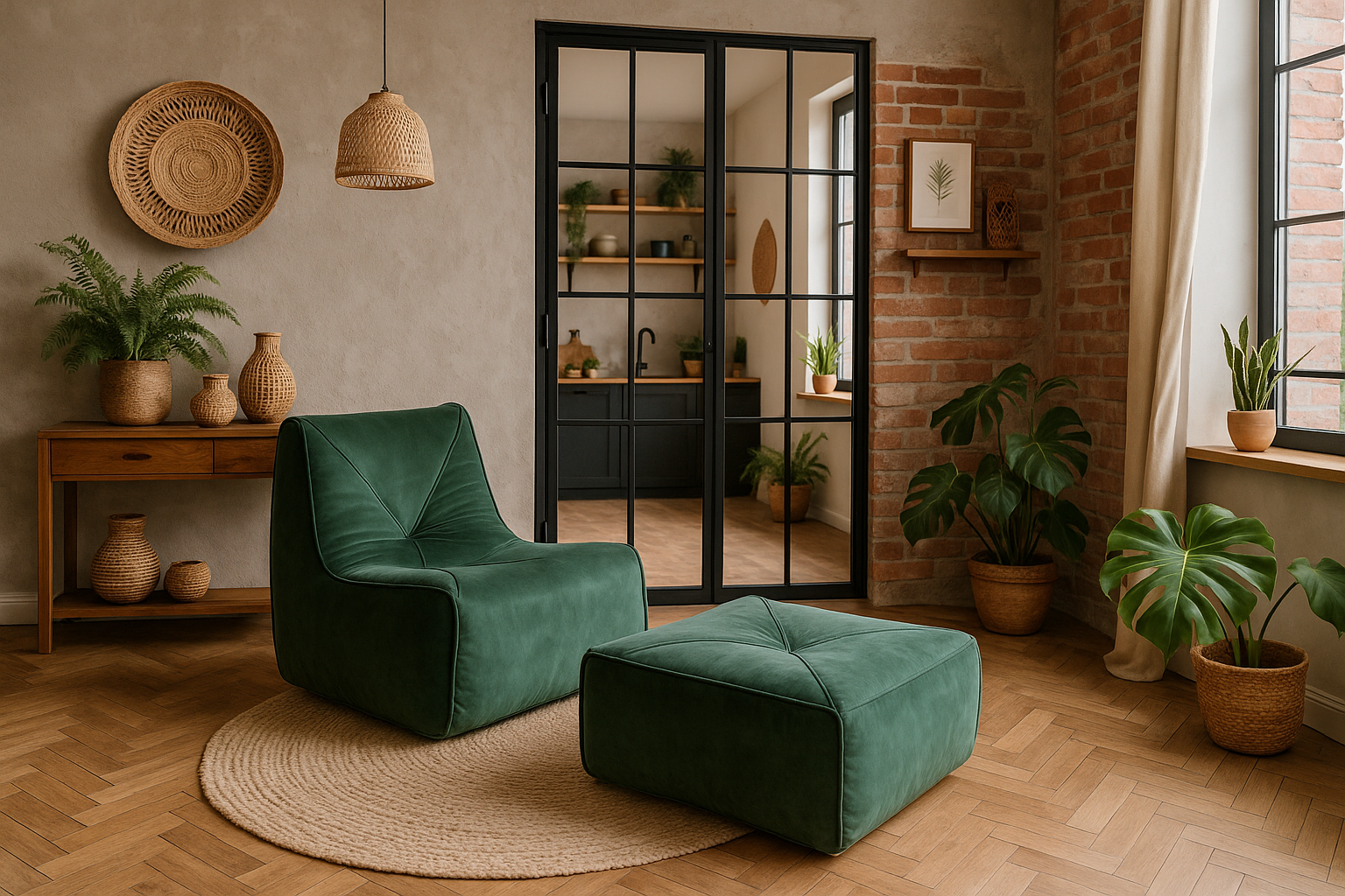 - Stylowy fotel z podnóżkiem w kolorze butelkowej zieleni, wykonany z gładkiej tkaniny welurowej ze srebrnym połyskiem. Prosty, ergonomiczny kształt wpasuje się w każde wnętrze.