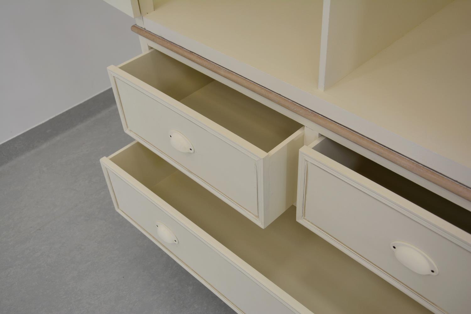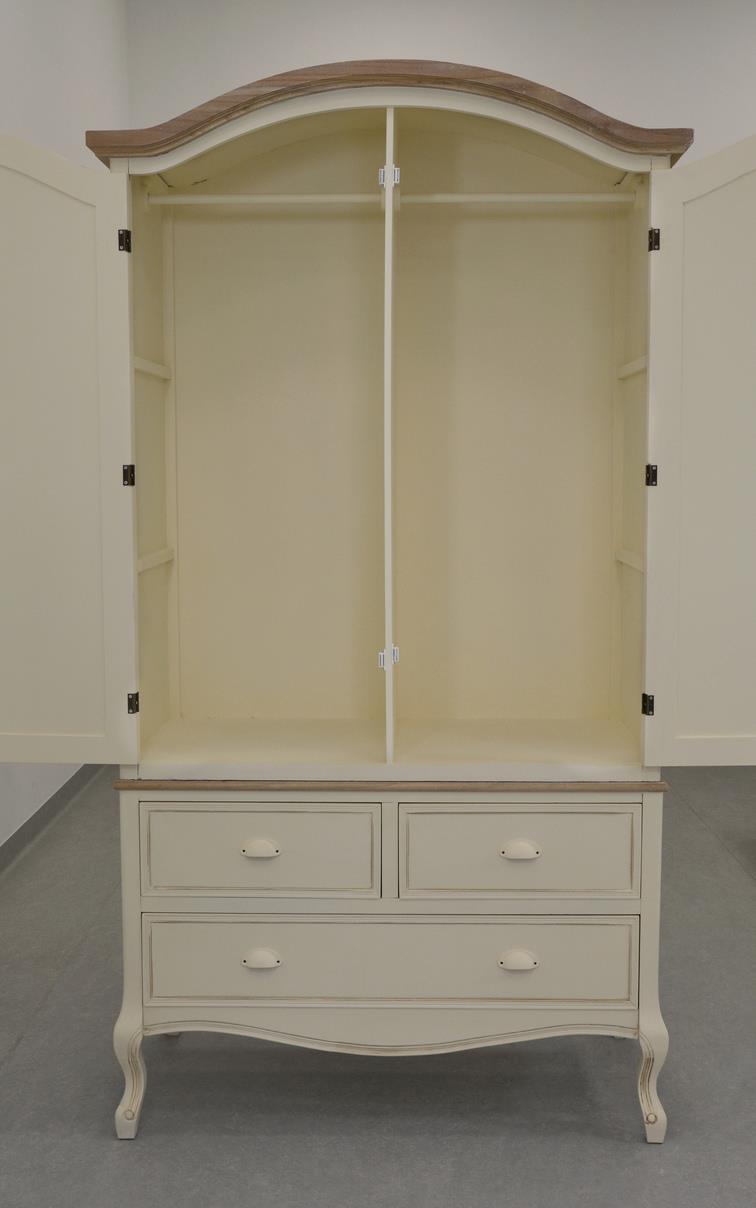 - Szafa ręcznie malowana w stylu prowansalskim na giętych nóżkach, posiada ozdobne metalowe uchwyty oraz rzeźbienia na cokole. Korpus jest w kolorze kremowymi, wieniec z frezowanymi krawędziami jest w kolorze jasnobrązowym.