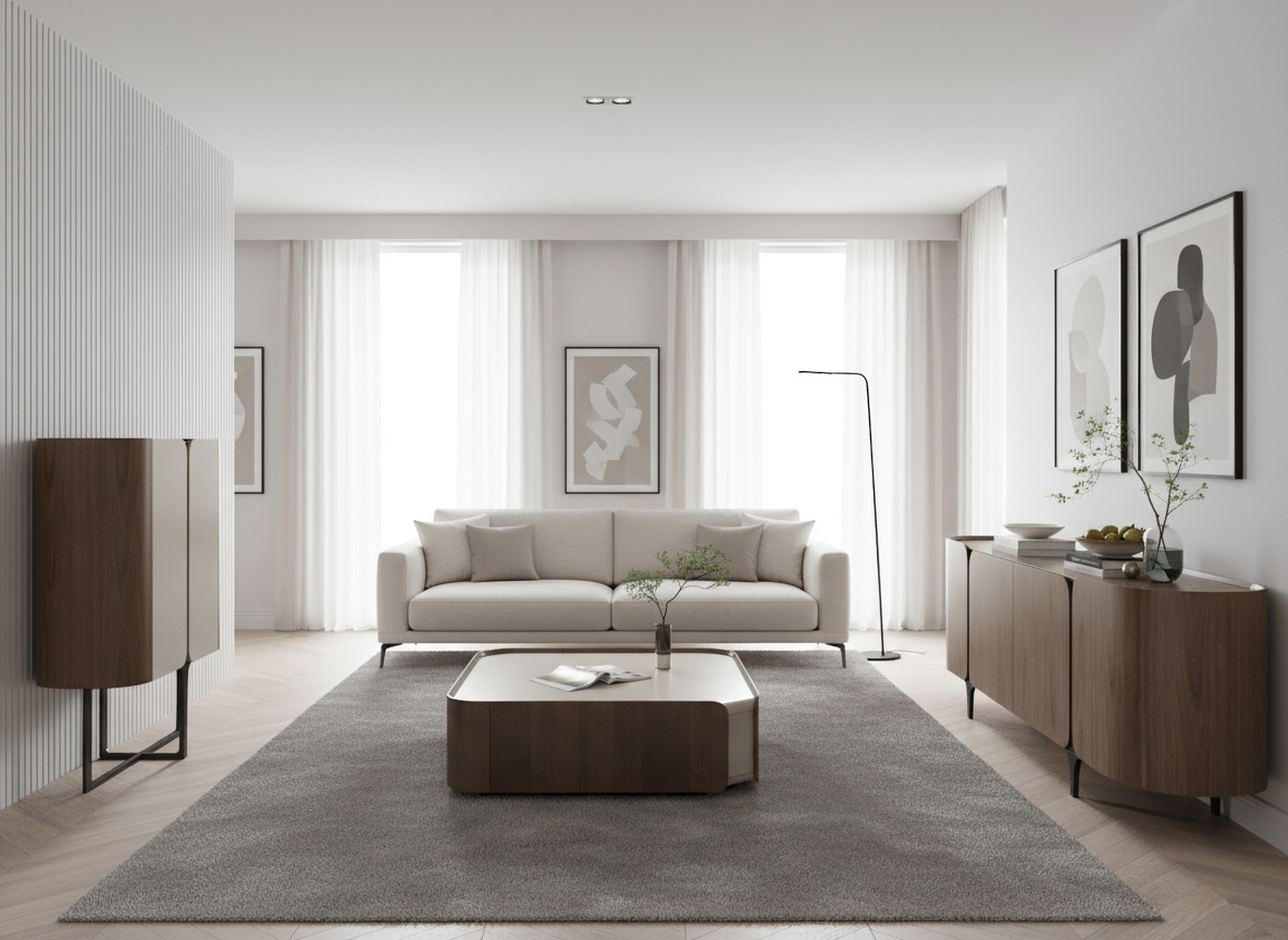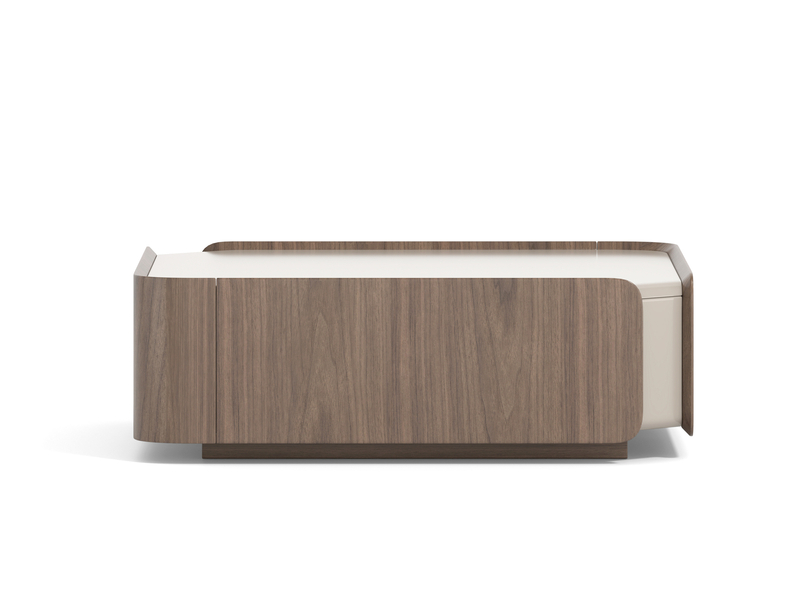 - Minimalistyczny stolik kawowy w kolorze kaszmiru i orzecha włoskiego z widoczną strukturą drewna. Bryła korpusu ma zaokrąglone boki a fronty obłe krawędzie.