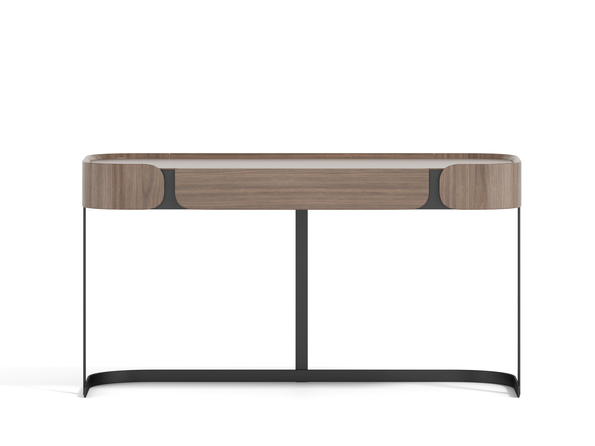 - Minimalistyczne biurko w kolorze orzecha włoskiego z widoczną strukturą drewna. Metalowa podstawa oraz akcenty są w kolorze czarnym. Bryła korpusu ma zaokrąglone boki a fronty obłe krawędzie.