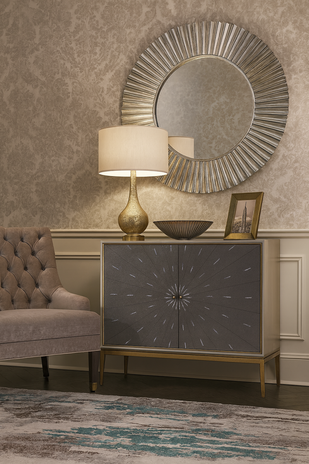 - Oryginalna komoda w kolorze szarym ze złotymi akcentami w postaci uchwytów, nóg i listwy ozdobnej wokół drzwi. Korpus jest pokryty okleiną z widoczną strukturą drewna, a drzwi pokryte są ekoskórą rekina (shagreen) z wzorem.