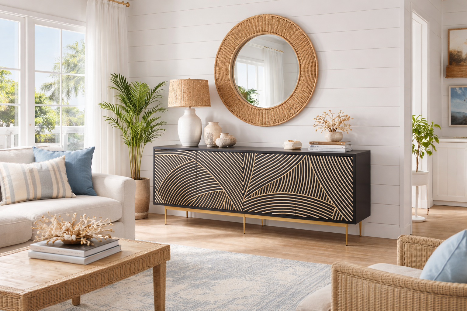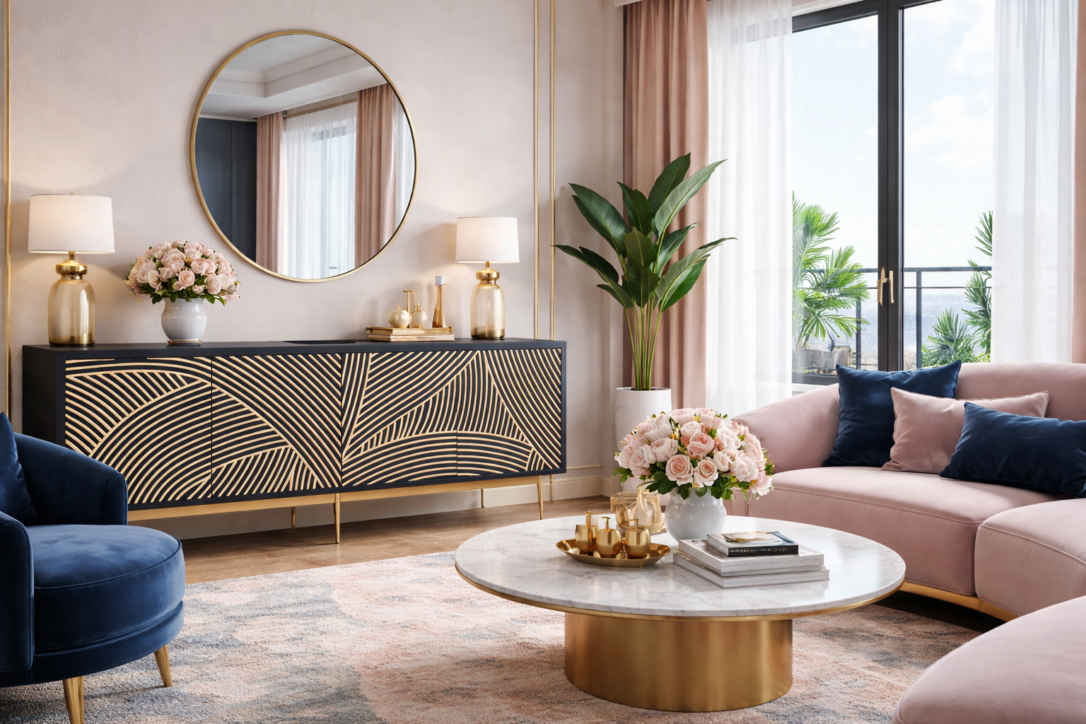 - Stylowa komoda rtv w kolorze ciemnogranatowym z frontem ze złotym, wypukłym wzorem w kształcie łagodnych linii oraz ze złotymi nogami. Gładki i jednolity korpus idealnie kontrastuje ze zdobionym frontem.