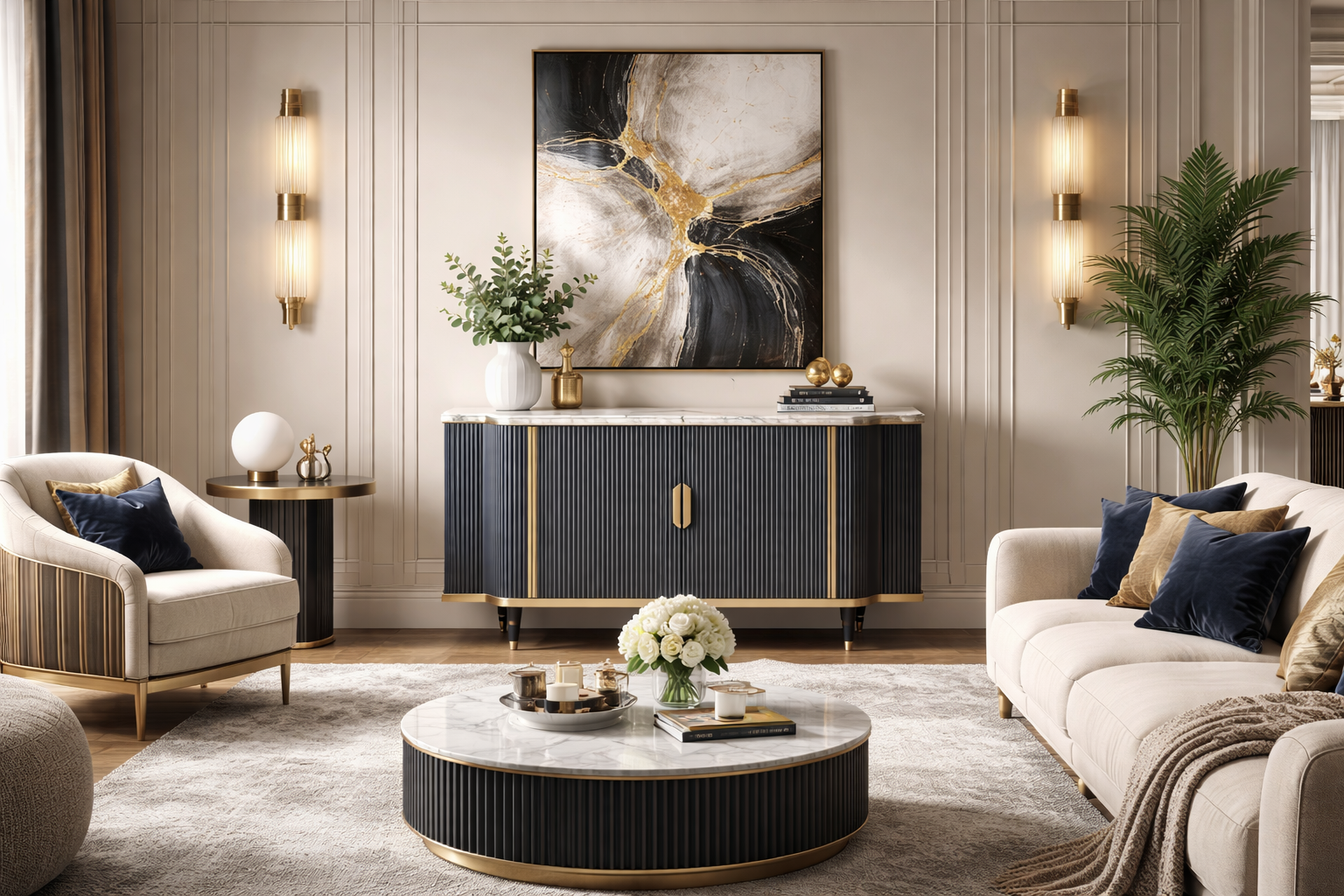 - Stylowa komoda w kolorze grafitowym ze złotymi akcentami. Korpus posiada ryflowane drewno. Blat ma wykończenie marmurowe.