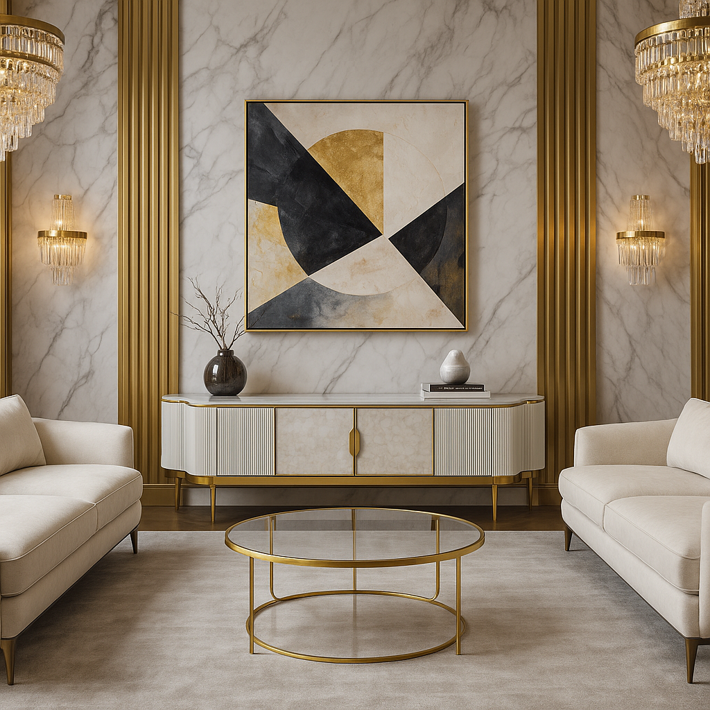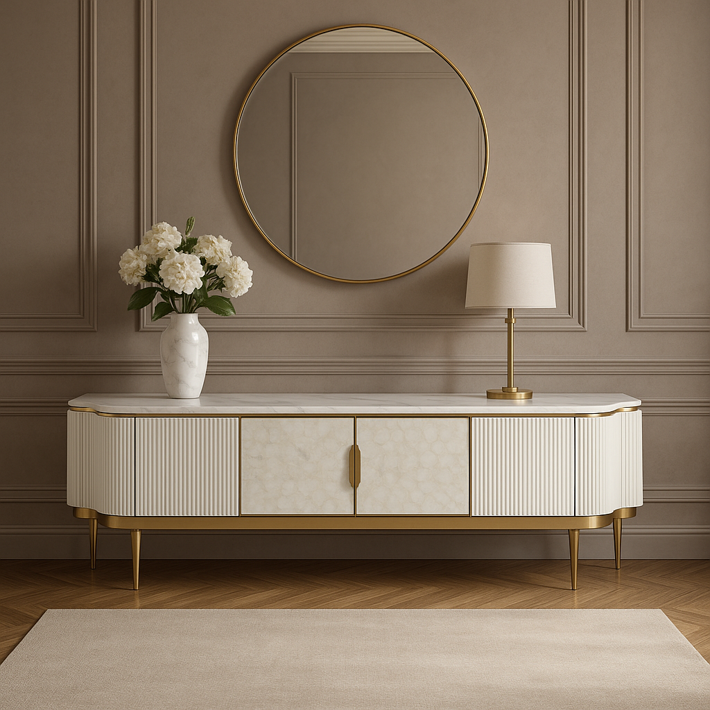 MDF, naturalna muszla morska, stal nierdzewna, blat: marmur syntetyczny