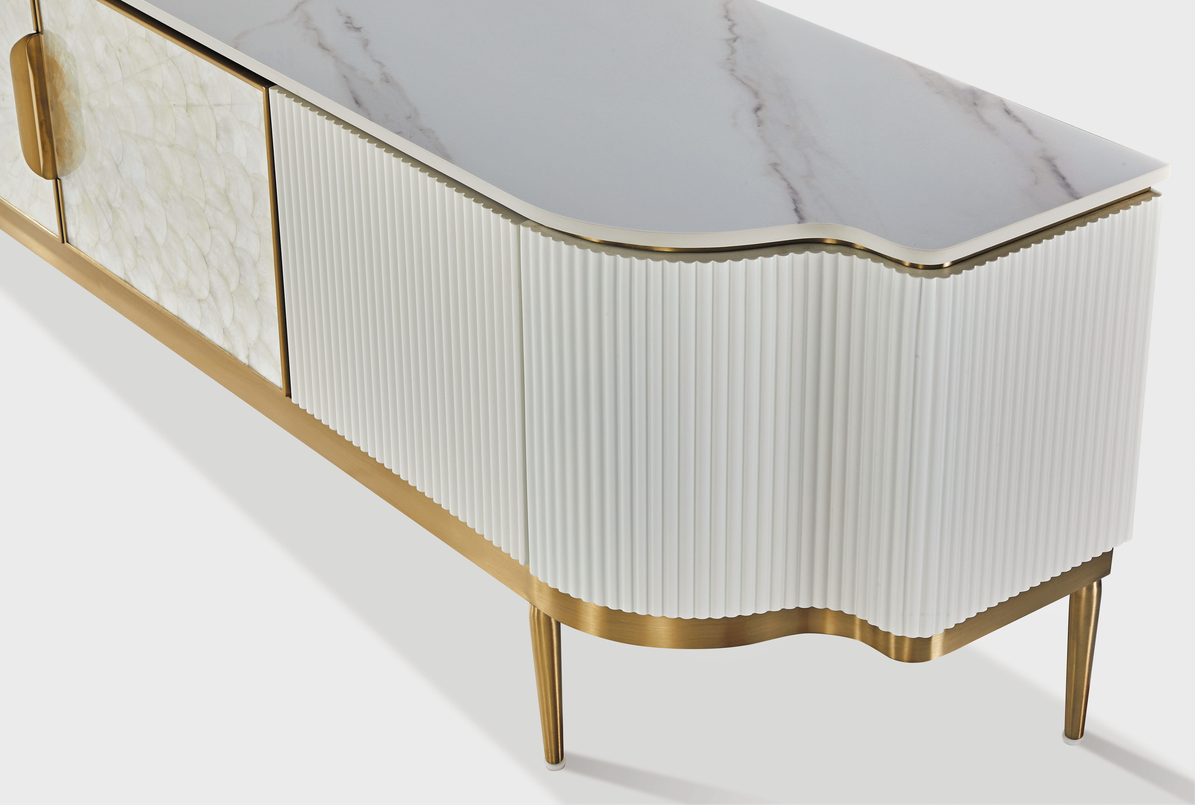 - Oryginalna komoda rtv w kolorze białym ecru z frontem wykonanym z naturalnej muszli układającej się w symetryczny wzór. Korpus posiada ryflowane drewno oraz blat z wykończeniem marmurowym.