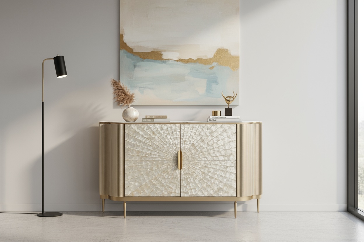 - Oryginalna komoda w kolorze szampańskiego złota z frontem wykonanym z naturalnej muszli układającej się w symetryczny wzór. Korpus posiada ryflowane drewno oraz blat z wykończeniem marmurowym.