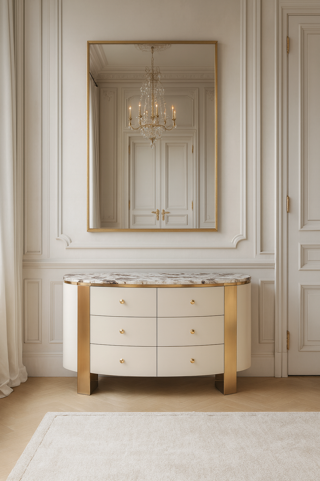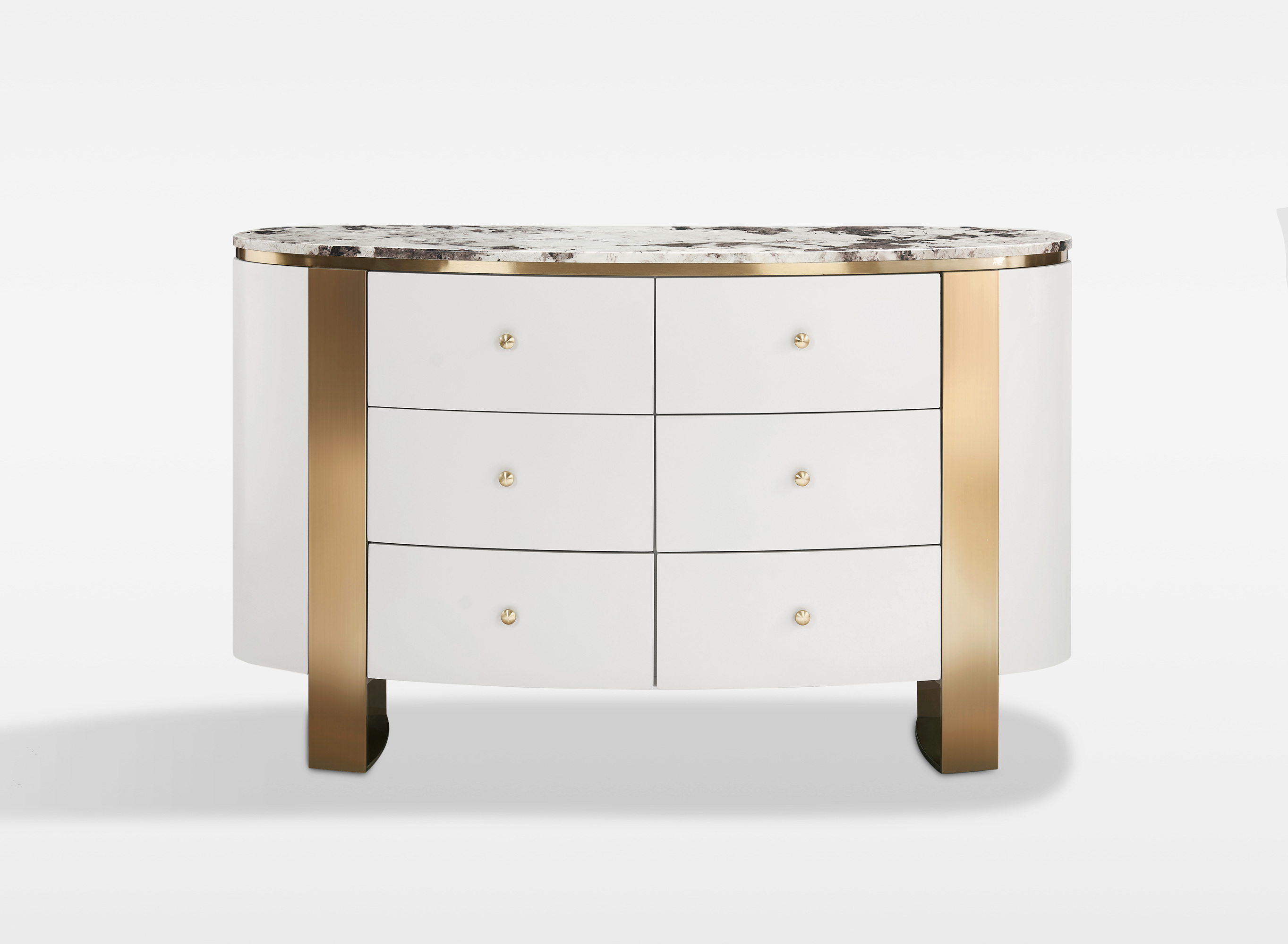 - Stylowa, owalna komoda w kolorze złamanej bieli ze złotymi akcentami w postaci listwy podblatowej oraz nóżkami łączącymi się wzdłuż frontów z blatem, który ma wykończenie marmurowe.