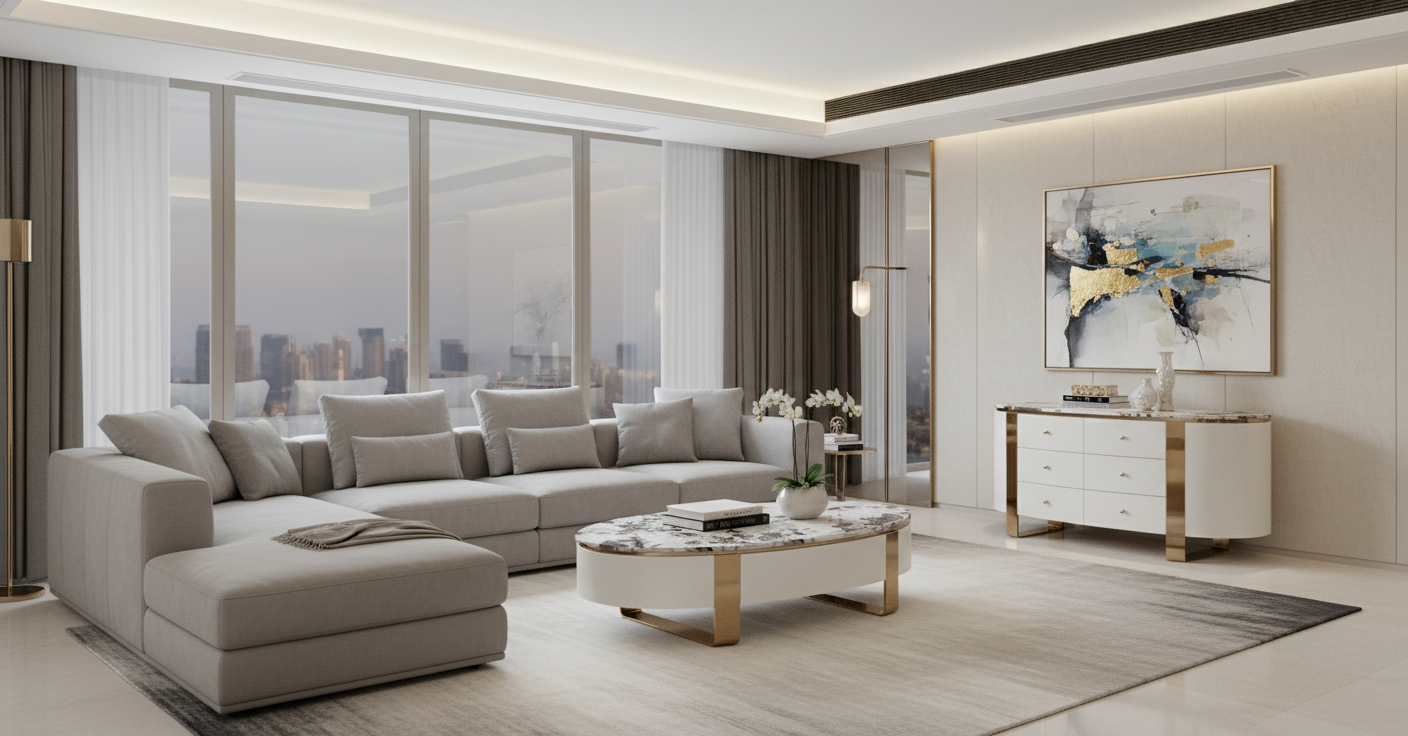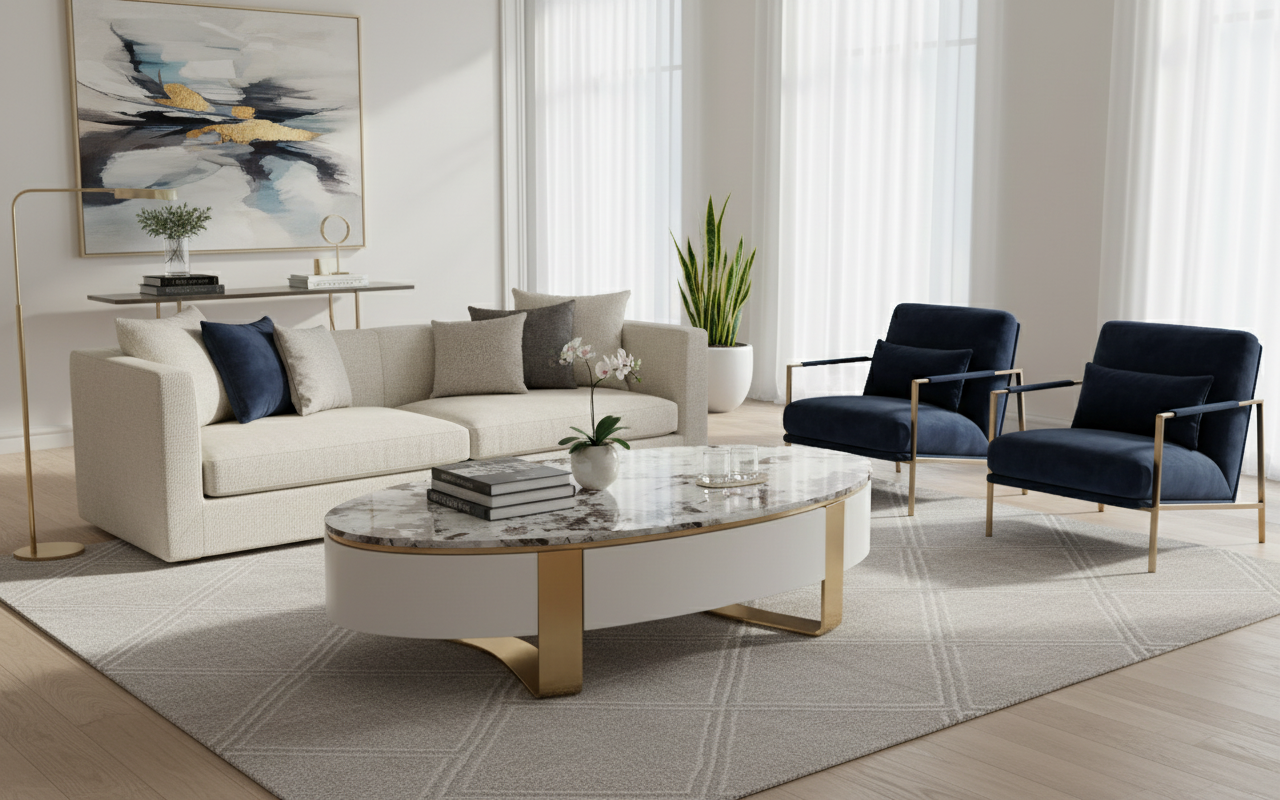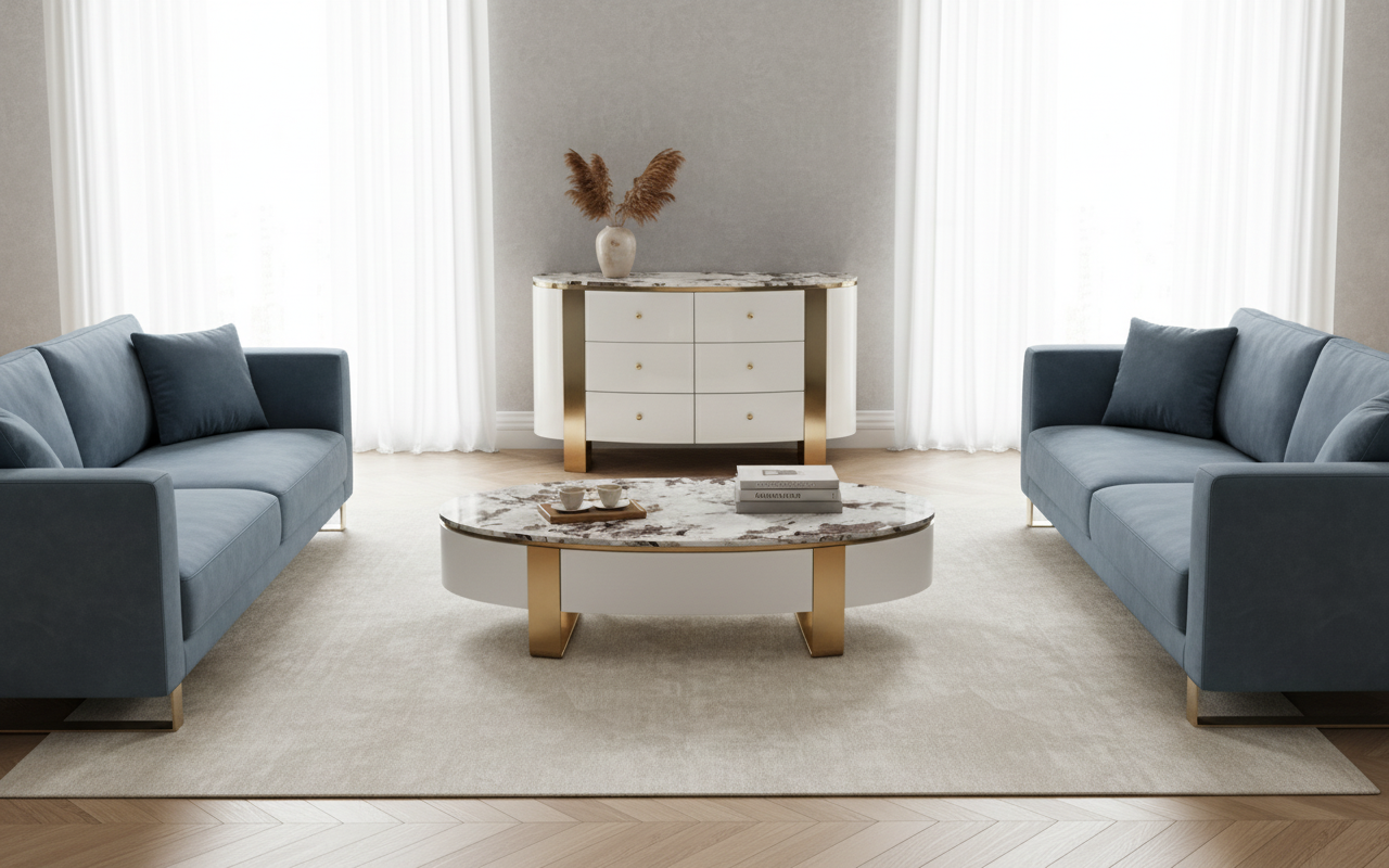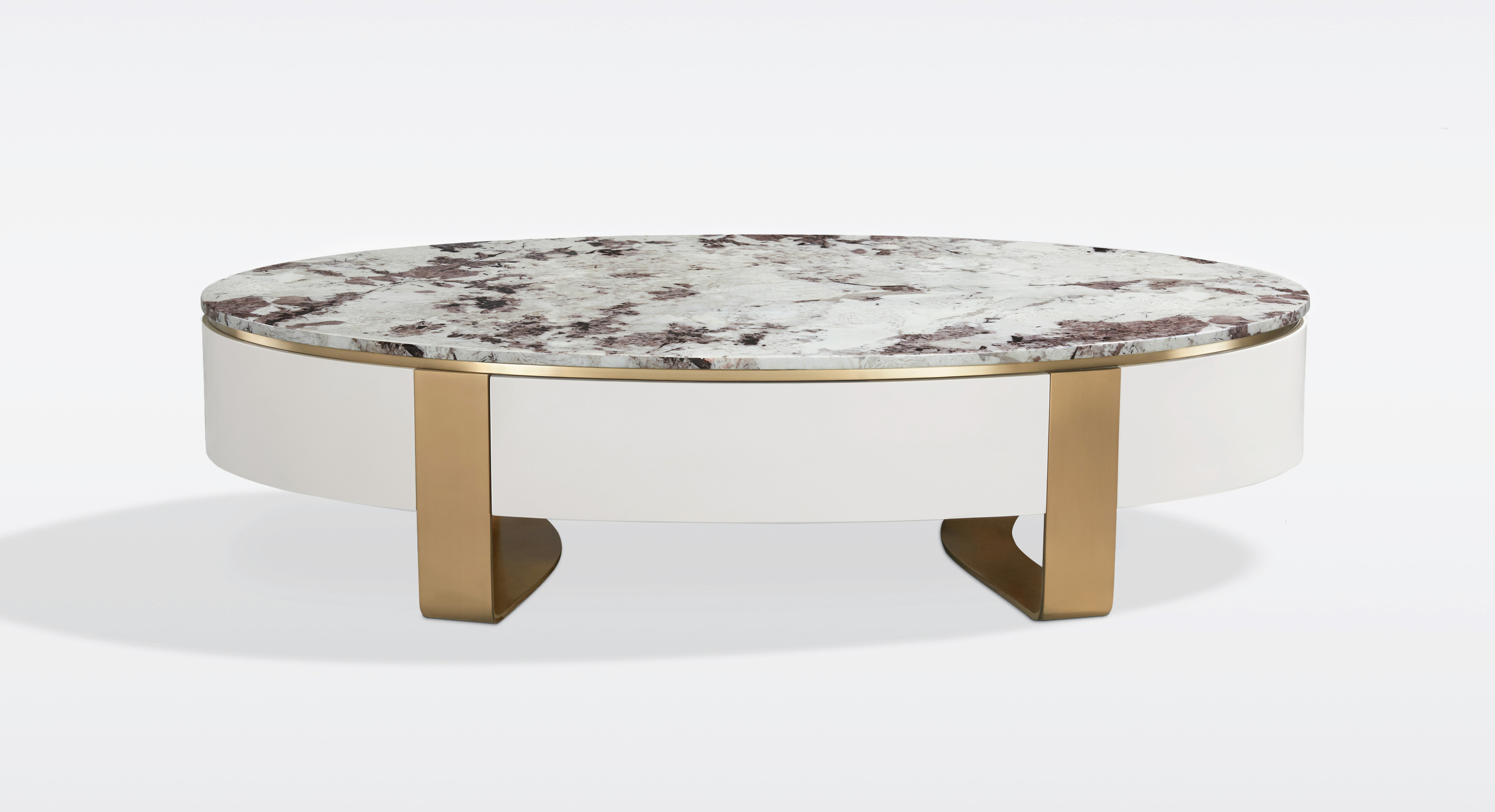 - Oryginalny, owalny stolik kawowy w kolorze złamanej bieli ze złotymi akcentami w postaci listwy podblatowej oraz nóżkami łączącymi się wzdłuż frontów z blatem, który ma wykończenie marmurowe.