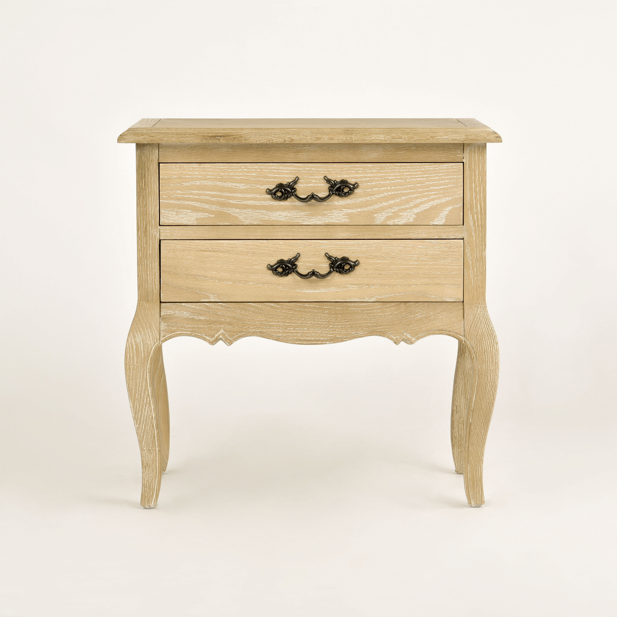 - Drewniana szafka na giętych nogach, w stylu francuskim. Korpus w kolorze naturalnego, bielonego drewna z widoczną strukturą. Szafka ma ozdobne, metalowe uchwyty w kolorze ciemnego mosiądzu frezowania oraz szczotkowaną powierzchnię.